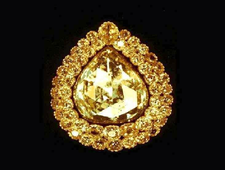 The Sancy, berlian kuning pucat, 55,23 karat (11,05 g), pernah dianggap dimiliki Mogul kuno, tapi lebih cenderung asal India karena potongan yang tidak biasa dengan standar Barat. Berperisai berbentuk batu terdiri dari dua mahkota back-to-back (bagian atas khas batu).