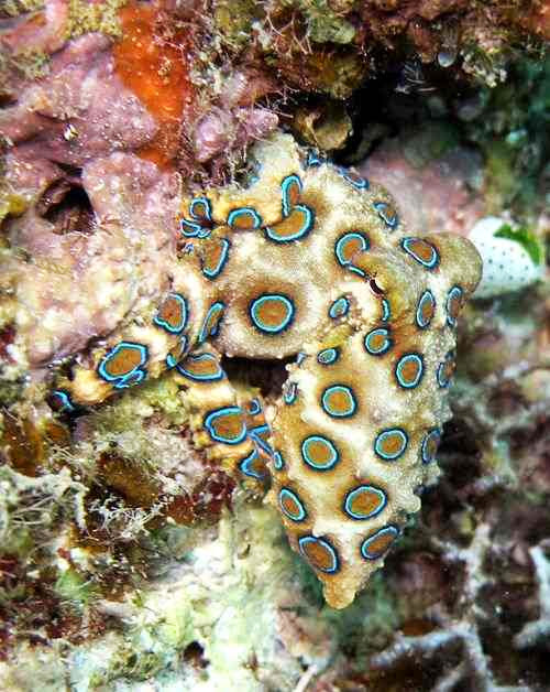 Gurita cincin biru, tiga (atau mungkin empat) jenis spesies gurita ini hidup di laut pasang dan terumbu karang di Pasifik dan Samudra Hindia, dari Jepang ke Australia (terutama di sekitar selatan New South Wales dan Australia Selatan).