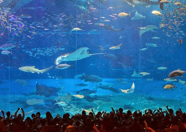 Tangki raksasa, The Kuroshio Sea Tank dapat dilihat dari berbagai arah, misalnya, dari Kamar Aqua dan melalui jendela akrilik besar. Di sini bisa menikmati pemandangan yang tidak pernah dilihat sebelumnya, seperti kelompok hiu paus dan ikan pari manta berenang di laut.